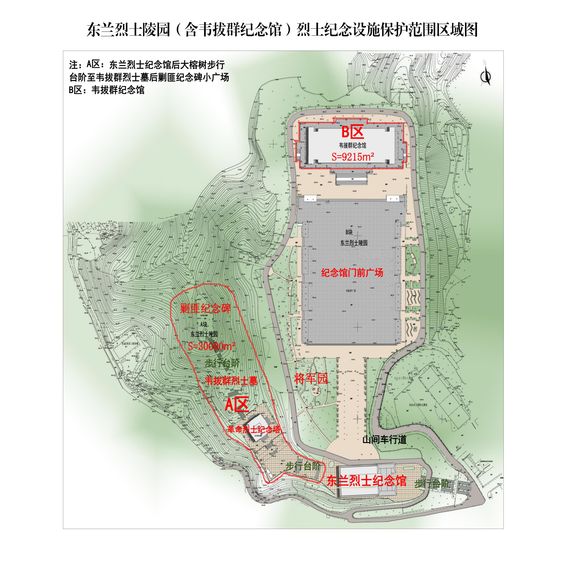 原则上以东兰烈士陵园烈士纪念设施保护范围区域图A、B两区红线为基准,红线内区域设为东兰烈士陵园的保护范围,A区:东兰烈士纪念馆后大榕树步行台阶至韦拔群烈士墓后剿匪纪念碑小广场;B区:韦拔群纪念馆。保护范围面积约39215平方米。
