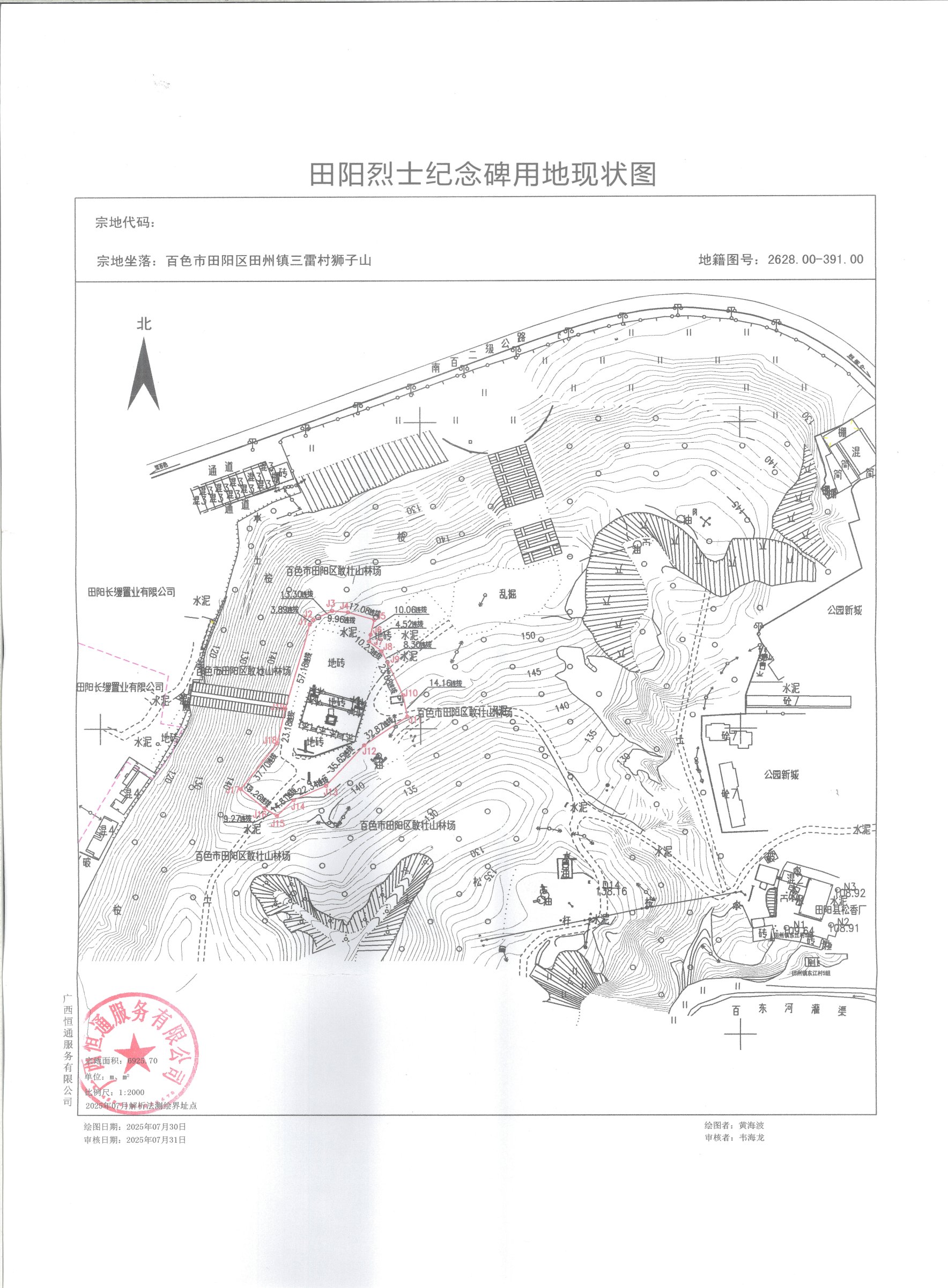 以田阳烈士纪念碑用地现状图红线为界向外各延伸1米为基准,该范围内区域设为田阳烈士纪念碑保护范围,保护范围面积约6925.70平方米。