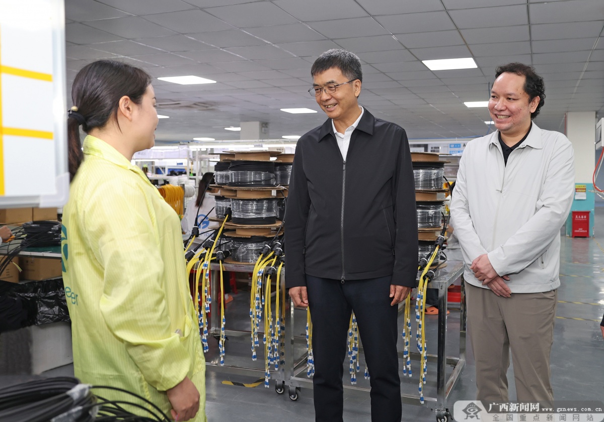 位于百色高新区的榕融新材料技术(广西)有限公司,有望建成全球规模最大的氧化铝连续纤维单体工厂。陈刚走进该企业展厅和生产车间,仔细了解产品研发等情况,勉励企业加大科研攻关力度,积极利用人工智能赋能、降本、增效,持续提升产品附加值和企业核心竞争力,努力做大做强做优企业;要求百色围绕铝产业转型升级,做好延链补链强链文章,引进更多铝产业优质上下游企业,推动铝产业高端化、智能化、绿色化发展。广西智昊通信科技公司生产的光纤产品大部分销往海外,开设的“就业帮扶车间”累计解决就业人数约1300人。陈刚来到该公司,详细了解企业生产和带农增收情况,与工人亲切交流,叮嘱企业强化订单对接和市场开拓,推动“小车间”对接“大市场”,吸纳更多群众在家门口就业增收。