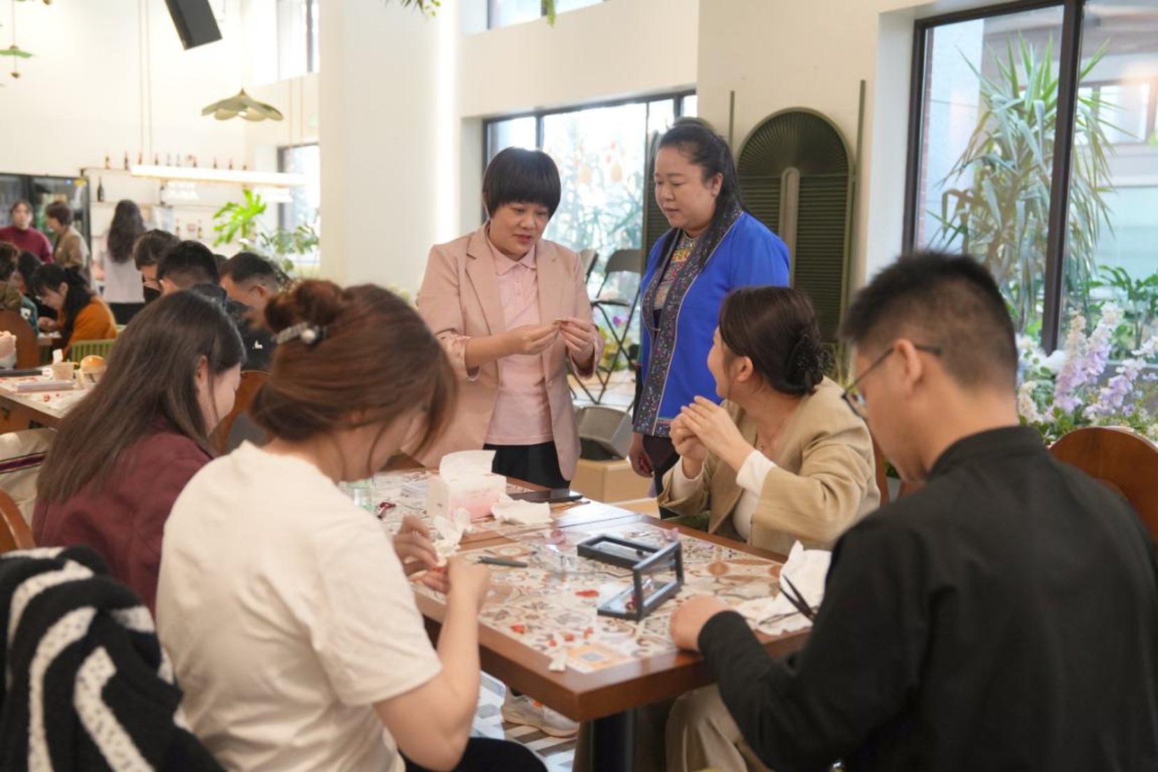 在壮锦挂饰制作环节,女职工们巧手拼接,一匹匹融合传统纹样与现代造型的壮锦马生动呈现,通过壮锦挂饰制作,既理解了壮锦文化内涵,又体验了传统工艺创新转化。活动尾声,女职工们手持自制的壮锦作品合影留念,大家表示:“今天的活动让我们在传统文化滋养中积蓄力量,下一步要以更饱满的热情投身退役军人服务事业”。