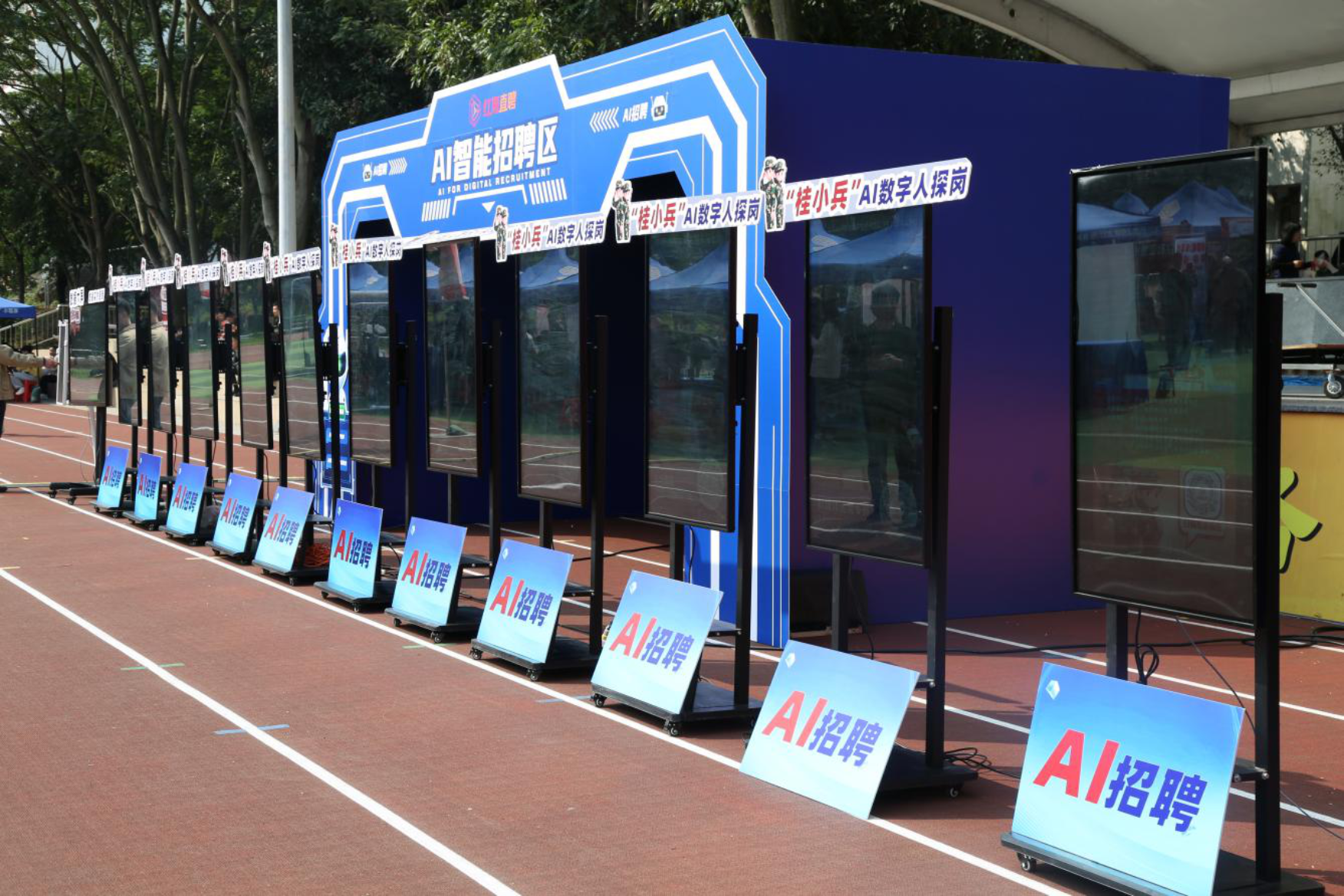 本次招聘会创新引入人工智能服务,现场设置AI就业招聘、直播带岗联播等互动功能区域。数字人“桂小兵”提供智能岗位匹配和AI面试指导等服务。数字人24小时直播带岗扩大岗位传播范围,同时配套一对一职业指导,全方位提升就业对接效率。通过“线下招聘+人工智能赋能+专业指导”模式,线上线下已吸引超7000人参与,初步达成就业意向730人次。