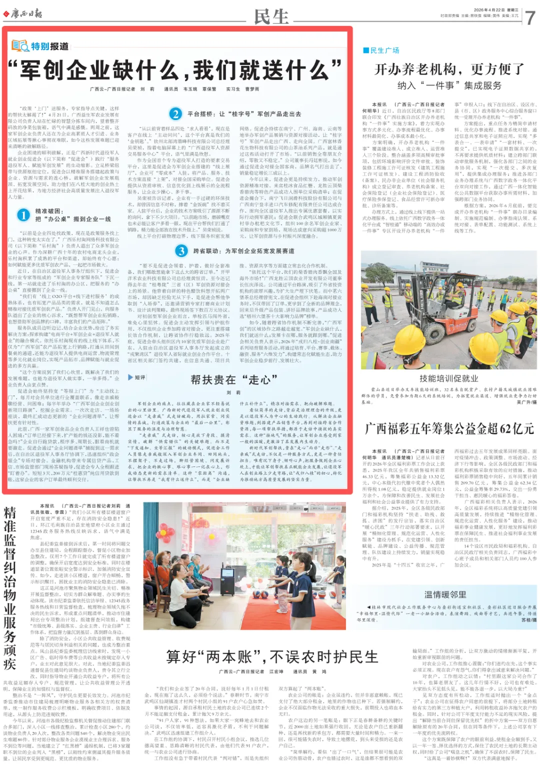 如今,随着跨省协作机制不断完善,“广西军创”的区域协作之路越走越宽。“军创企业缺什么,我们就送什么;发展卡在哪,服务就跟到哪。”促进会相关负责人表示,2026年“戎归八桂·创业南疆”系列培育服务活动,将通过培育、平台、赛事、载体、融资、服务“六维发力”,构建常态化赋能生态,助力军创企业稳步前行、发展壮大。