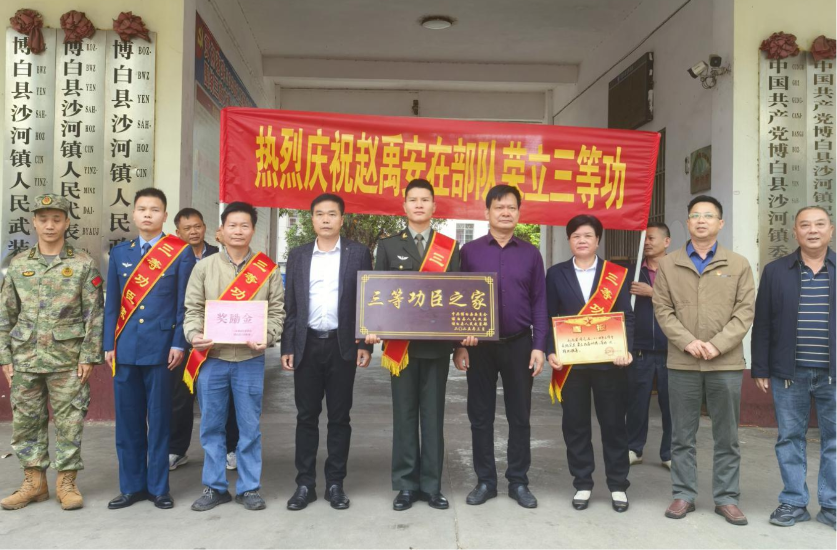 近日,博白县退役军人事务局联合相关单位,为荣立三等功的现役军人赵禹安、蓝桂才家庭送立功喜报。(王洪丹)