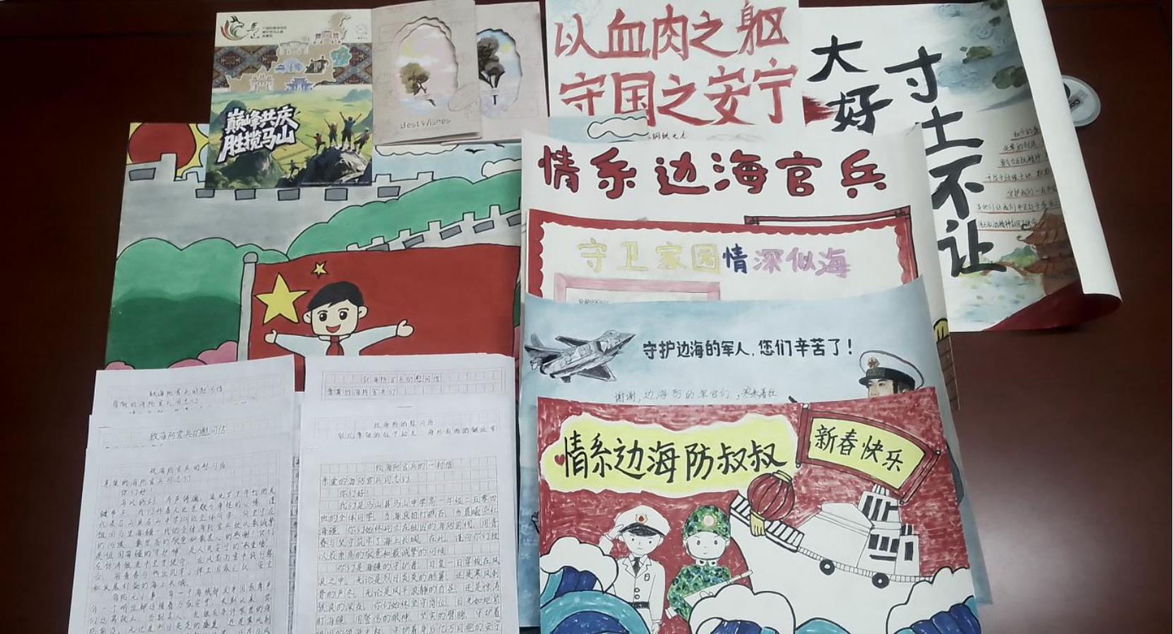 近日,马山县退役军人事务局联合县校外活动中心慰问边海防官兵,并赠送小学生表达敬意的手工画、慰问信、贺卡等。(覃梁化)
