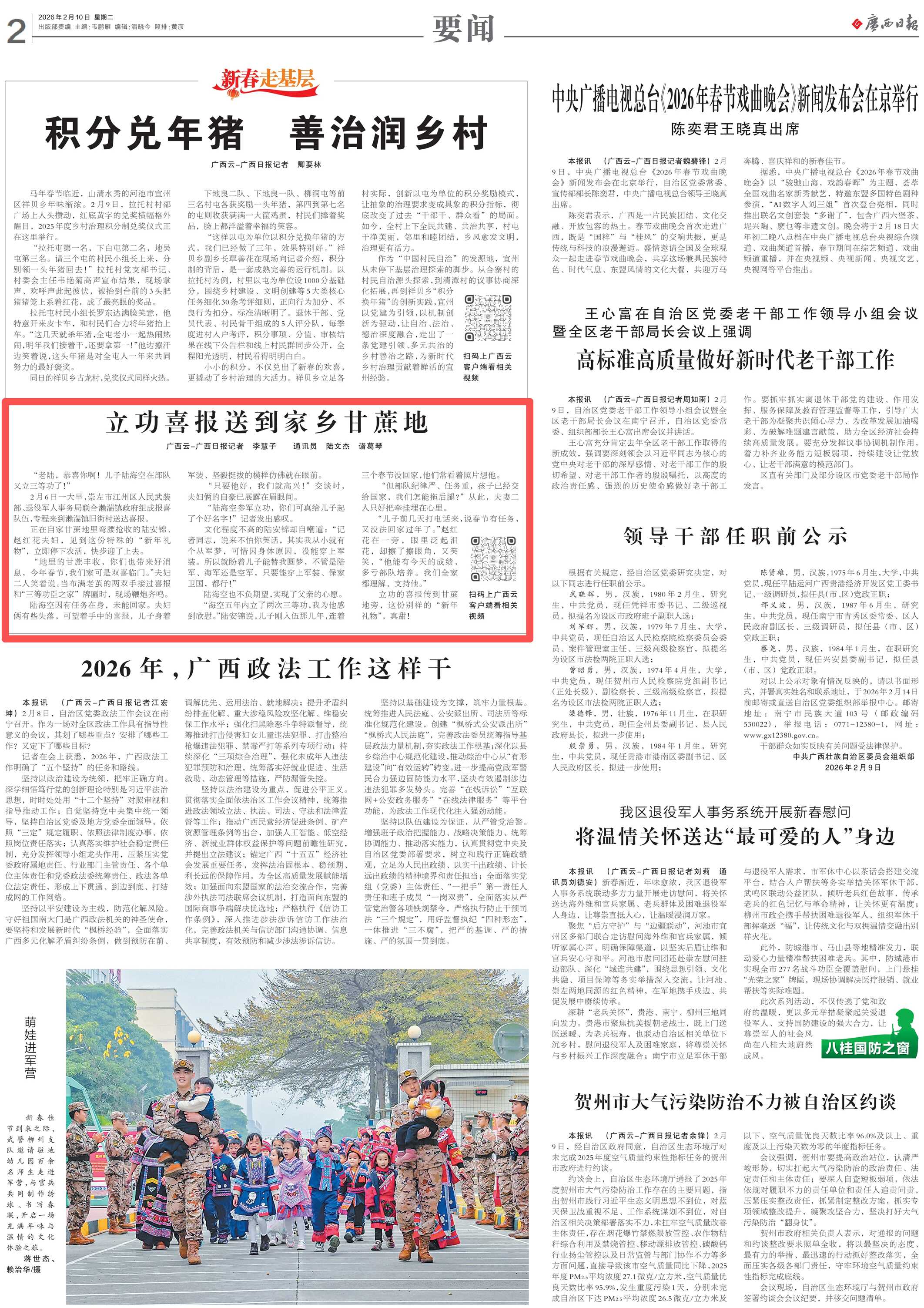 2月6日一大早,崇左市江州区人民武装部、退役军人事务局联合濑湍镇政府组成报喜队伍,专程来到濑湍镇旧街村送达喜报。