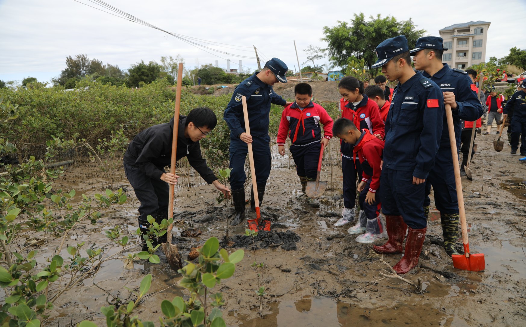 在滩涂上,技术人员向大家现场讲解红树林苗种植要求,与海警战士、少先队员们率先种下第一棵树苗。随后,全体人员分散在滩涂展开种植,不到一小时,就种下了500余株红树林幼苗,绵延数百米的“双拥林”雏形初现。