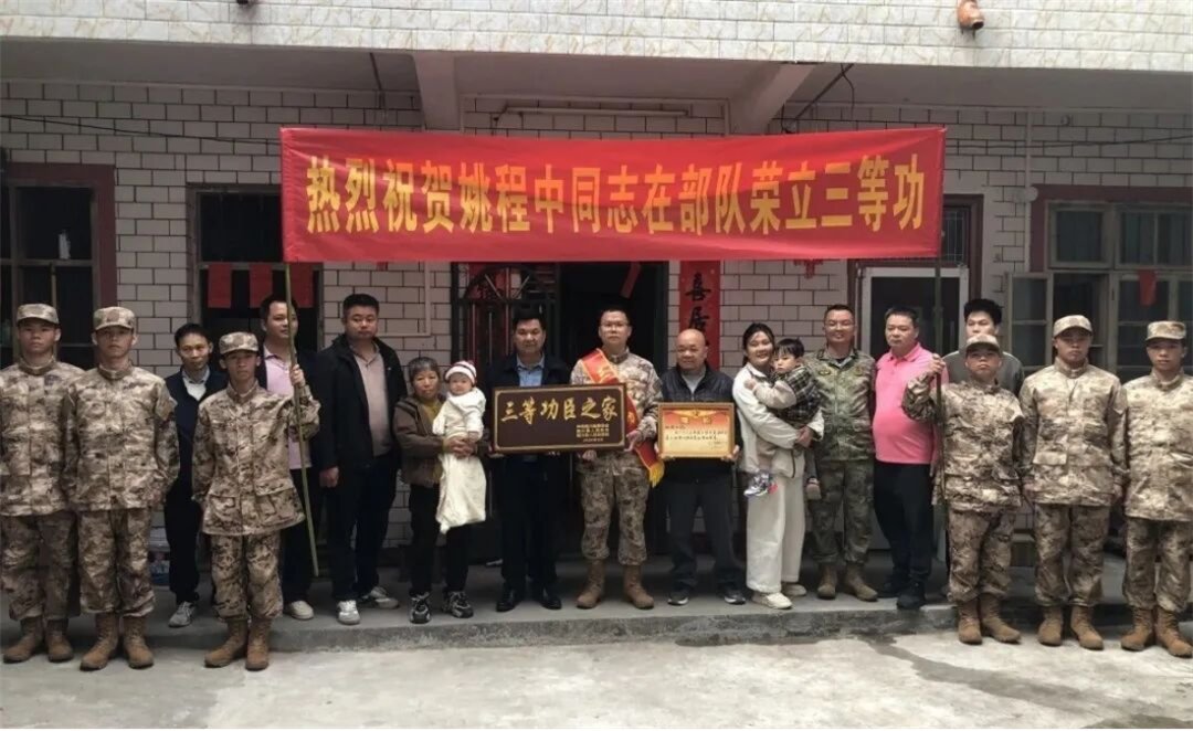 3月13日,陆川县退役军人事务局联合相关单位,为荣立三等功的现役军人姚程中家庭送立功喜报。(姚世亮)