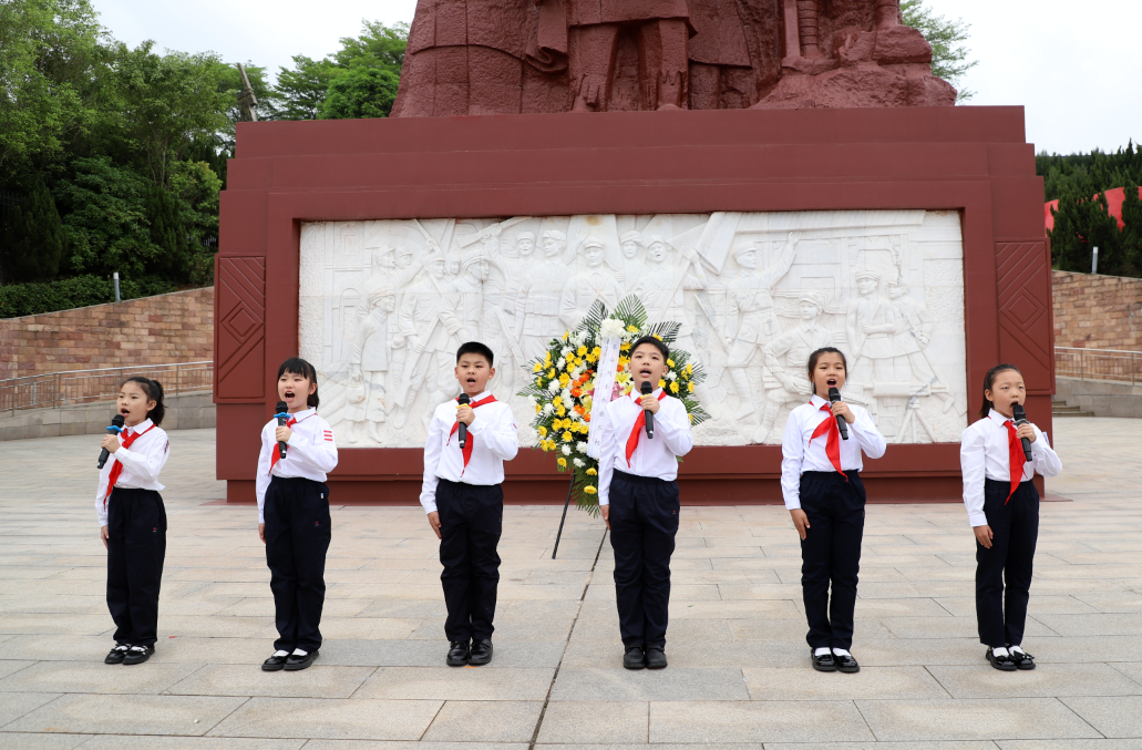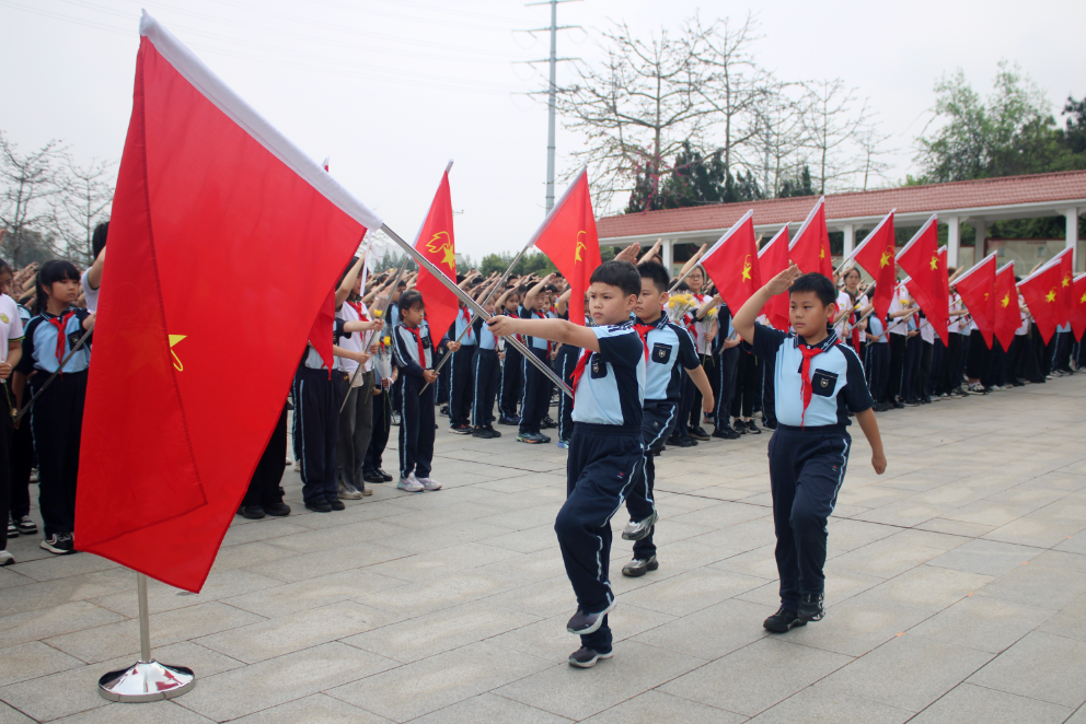上午9时,活动在庄严肃穆的氛围中拉开帷幕。伴随着激昂的出旗曲,三名旗手高举队旗,迈着整齐有力的步伐行进至烈士纪念碑前,全体少先队员庄严敬礼,奏唱中华人民共和国国歌,雄壮的歌声在烈士纪念碑前回荡。随后,全体人员向烈士默哀,深切缅怀为民族独立、人民解放、国家富强献出宝贵生命的革命先烈。伴随着庄严的《献花曲》,礼兵抬着花篮,正步行进,缓缓将花篮敬献于纪念碑基座前。