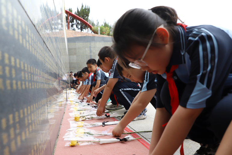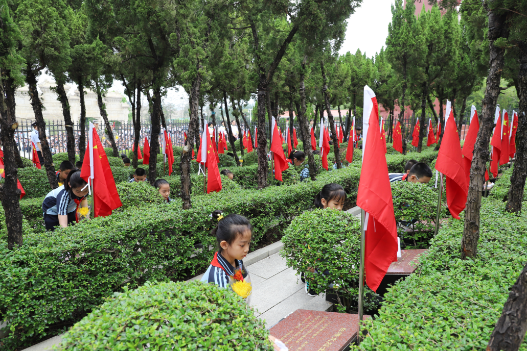 少先队员为烈士擦拭墓碑并敬献鲜花