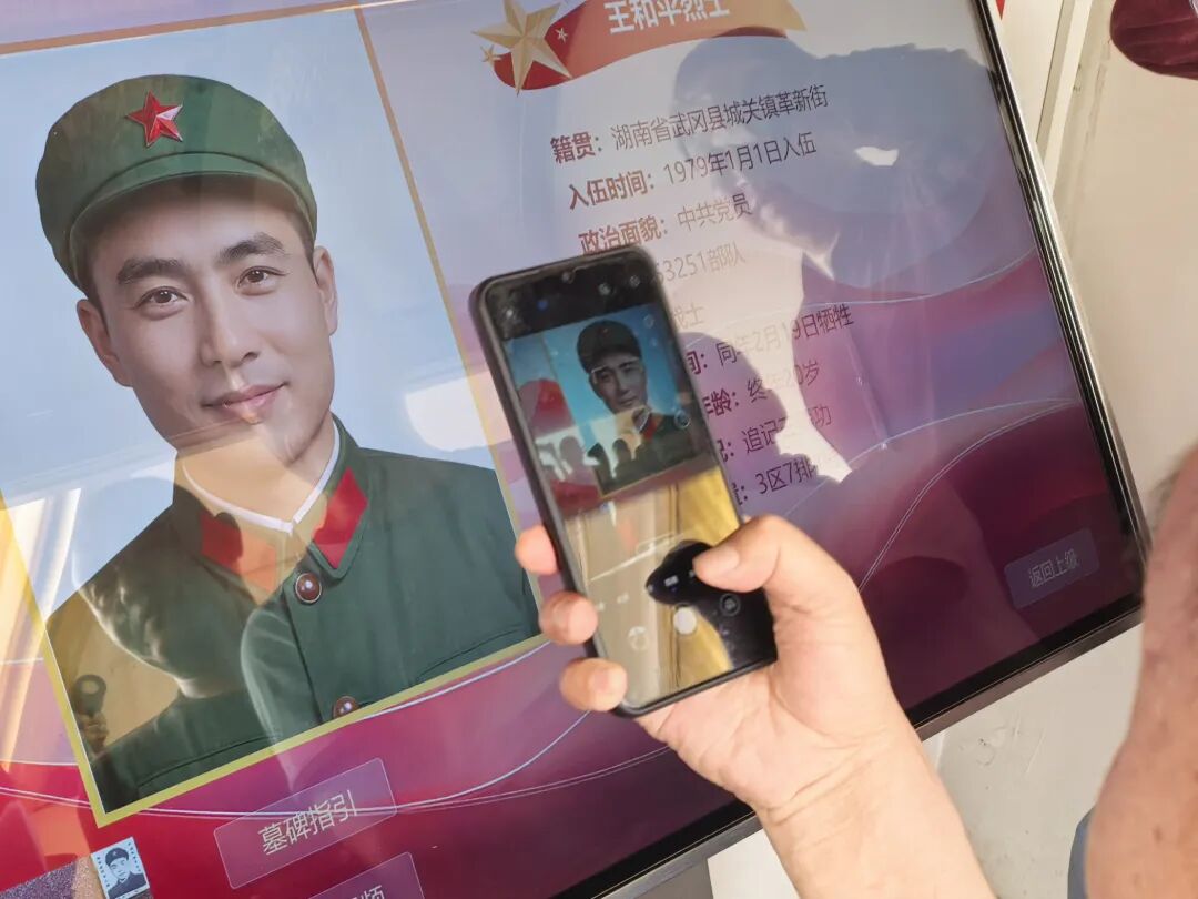 与她同行的55岁老乡毛国胜,对哥哥毛国林烈士的记忆仅存于儿时的零星片段。“哥哥牺牲时,我才8岁。以前来扫墓,看着墓碑上模糊的照片,总觉得哥哥离我们很远。”他轻轻抚摸屏幕,指尖划过烈士的脸颊,“现在好了,AI让我看清了哥哥的样子,以后我每次来,都能好好看看他了。”