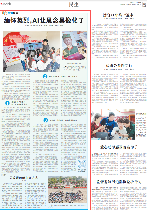 清明前夕,崇左市龙州烈士陵园的AI烈士英名查询系统显示屏上,烈士相片被清晰复原、AI动态视频语音缓缓响起,前来祭奠的烈属、老兵久久注视着屏幕,眼中不禁泛起泪光。