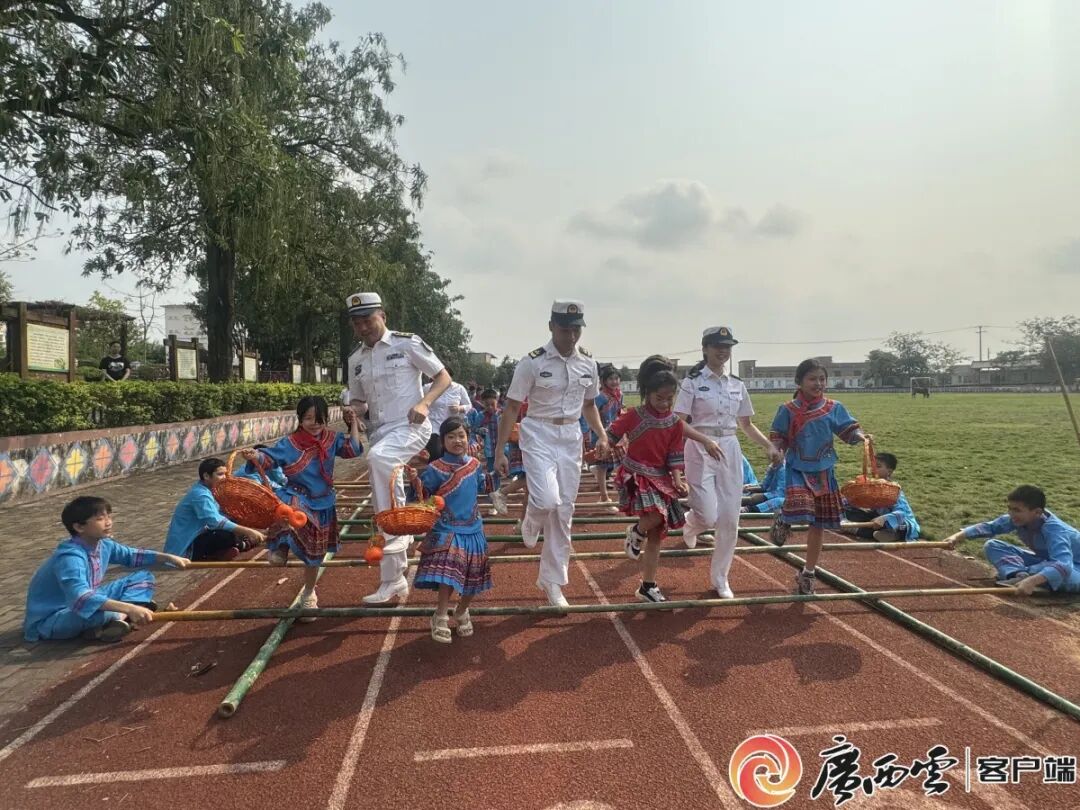 2024年,广西舰海军官兵与庆乐小学开展“民族团结进步”共建活动。图为官兵和孩子们一起跳竹竿舞。 庆乐小学 供图