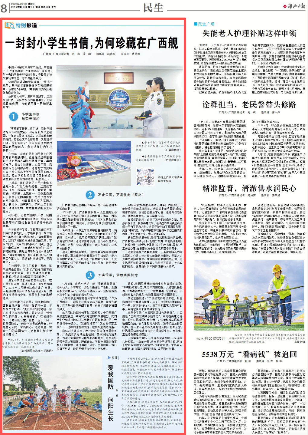新修订的《中华人民共和国国防教育法》实施,全民国防不再是抽象口号,而是扎根日常、触达人心。南宁武鸣区庆乐小学与广西舰的互动往来,正是落实国防教育法的生动实践。孩子们提笔写信,是出于对以家乡命名的战舰的自豪,对守护海疆官兵的崇敬;官兵们珍藏书信,是源于对这份纯粹心意的珍视,是对身后家国的感念。