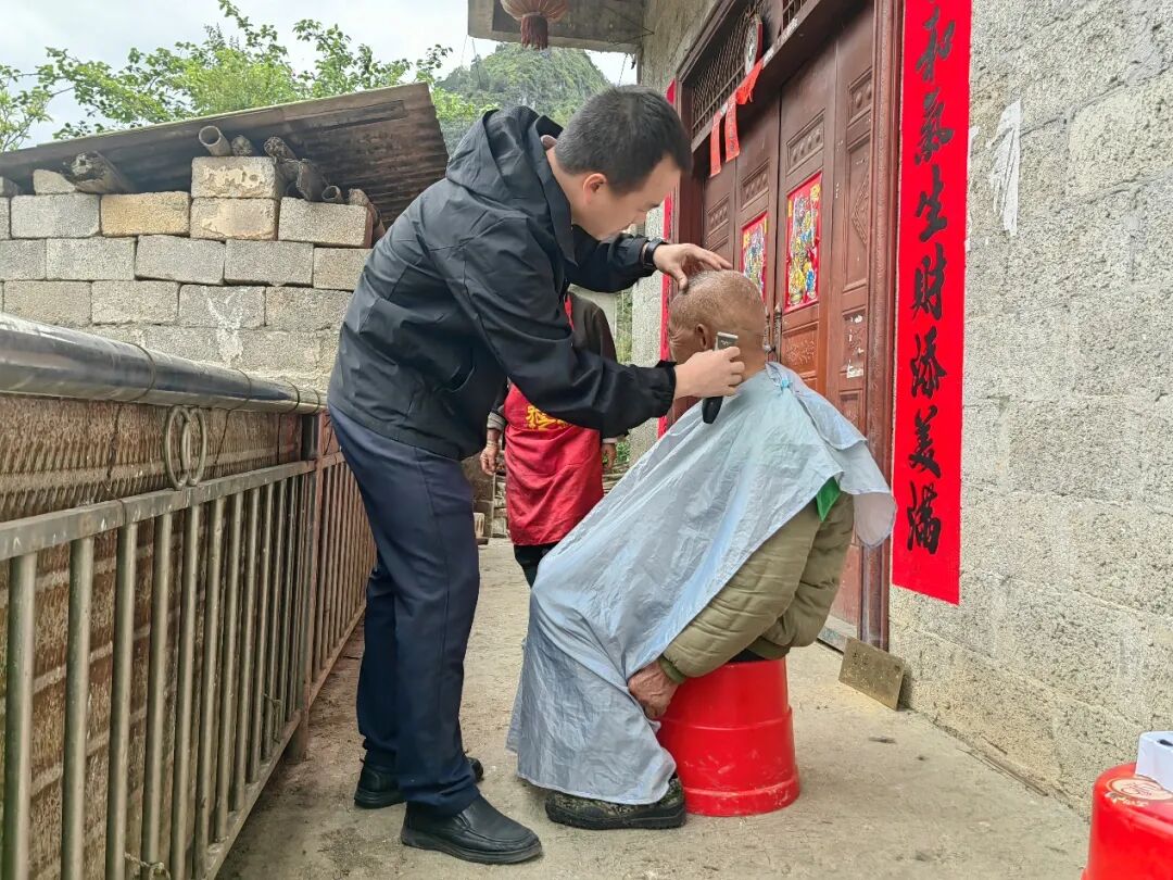 近日,凤山县江洲瑶族乡退役军人服务站上门为部分高龄或行动不便的退役军人提供免费理发等服务。(姜国敬)