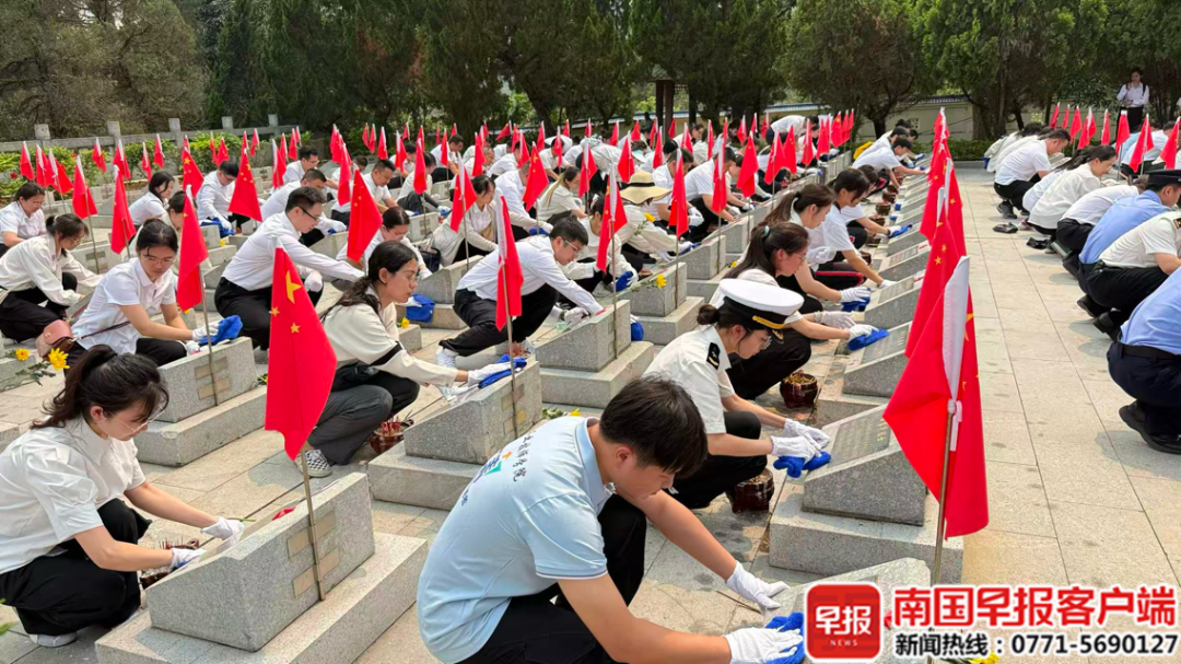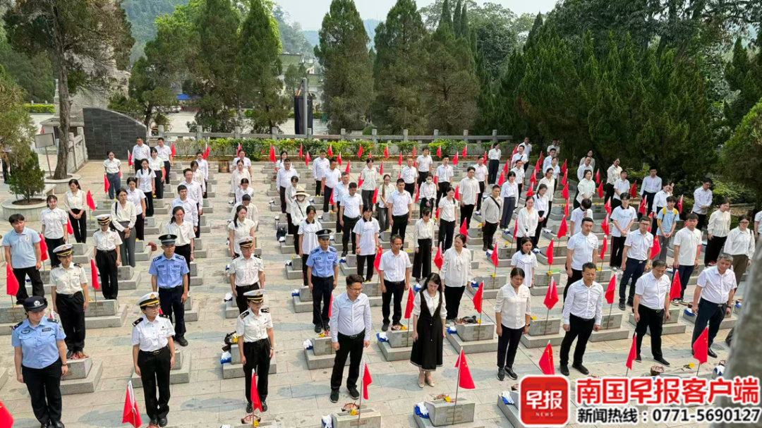 4月8日,由自治区退役军人事务厅、共青团广西区委、自治区党委区直机关工委、自治区党委党史研究室联合举办的“赓续红色血脉 激扬青春担当”主题团日活动暨“纪念碑下的思政课”思想政治教育示范性活动在凭祥市匠止烈士陵园举行。近百名青年代表齐聚于此,为烈士擦拭墓碑,敬献鲜花,用行动缅怀英烈、传承精神,在行走的课堂中感悟青春担当。