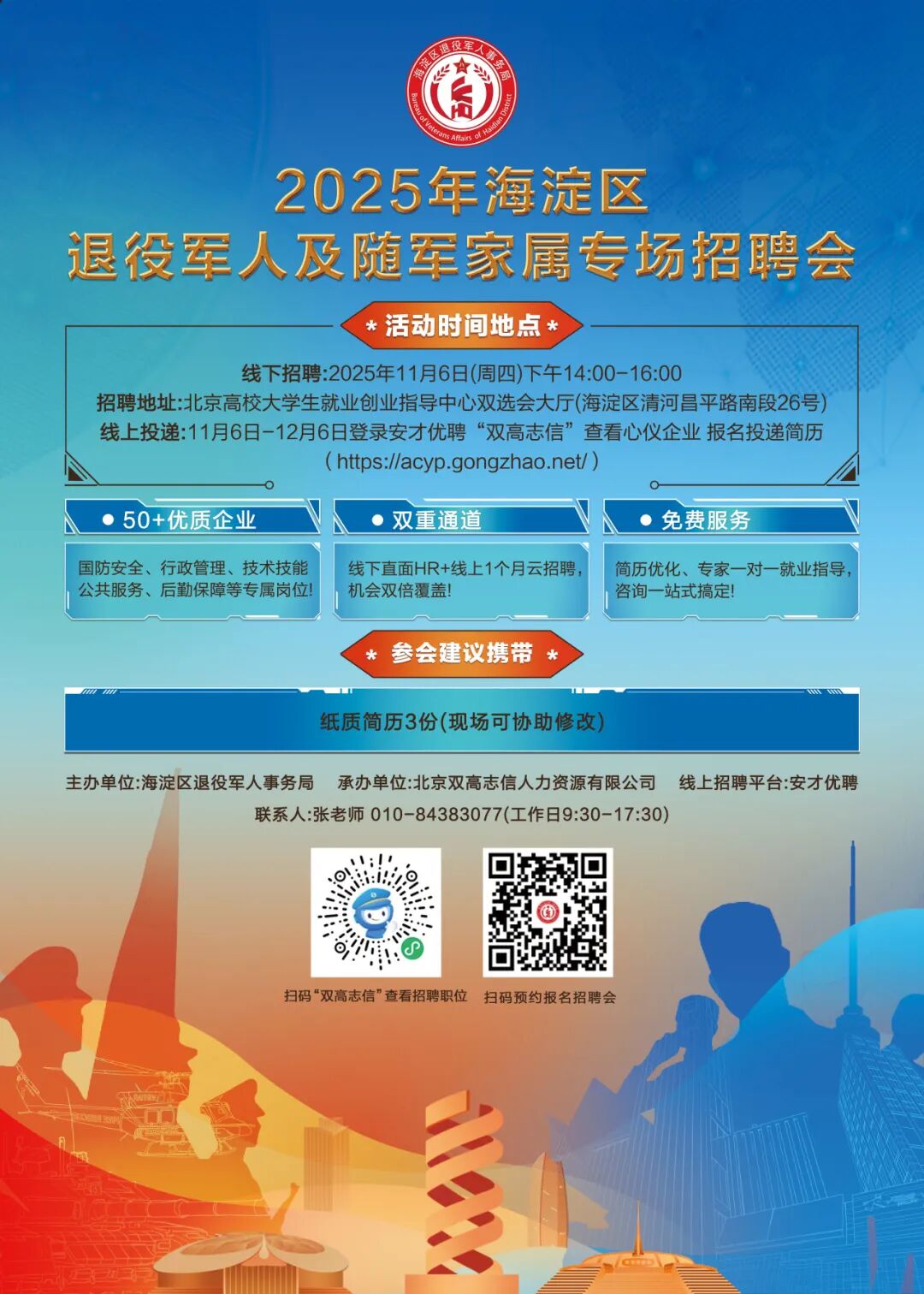 活动详情:本次招聘会汇聚50家优质用人单位,涵盖中央企业、国有企业、军创企业等多元类型。岗位资源丰富,涉及人工智能、互联网技术、安保科技、现代服务、智慧物业、教育等朝阳产业,提供国防安全、文职辅警、综合行政、行业研究、技术技能等多元化优质岗位