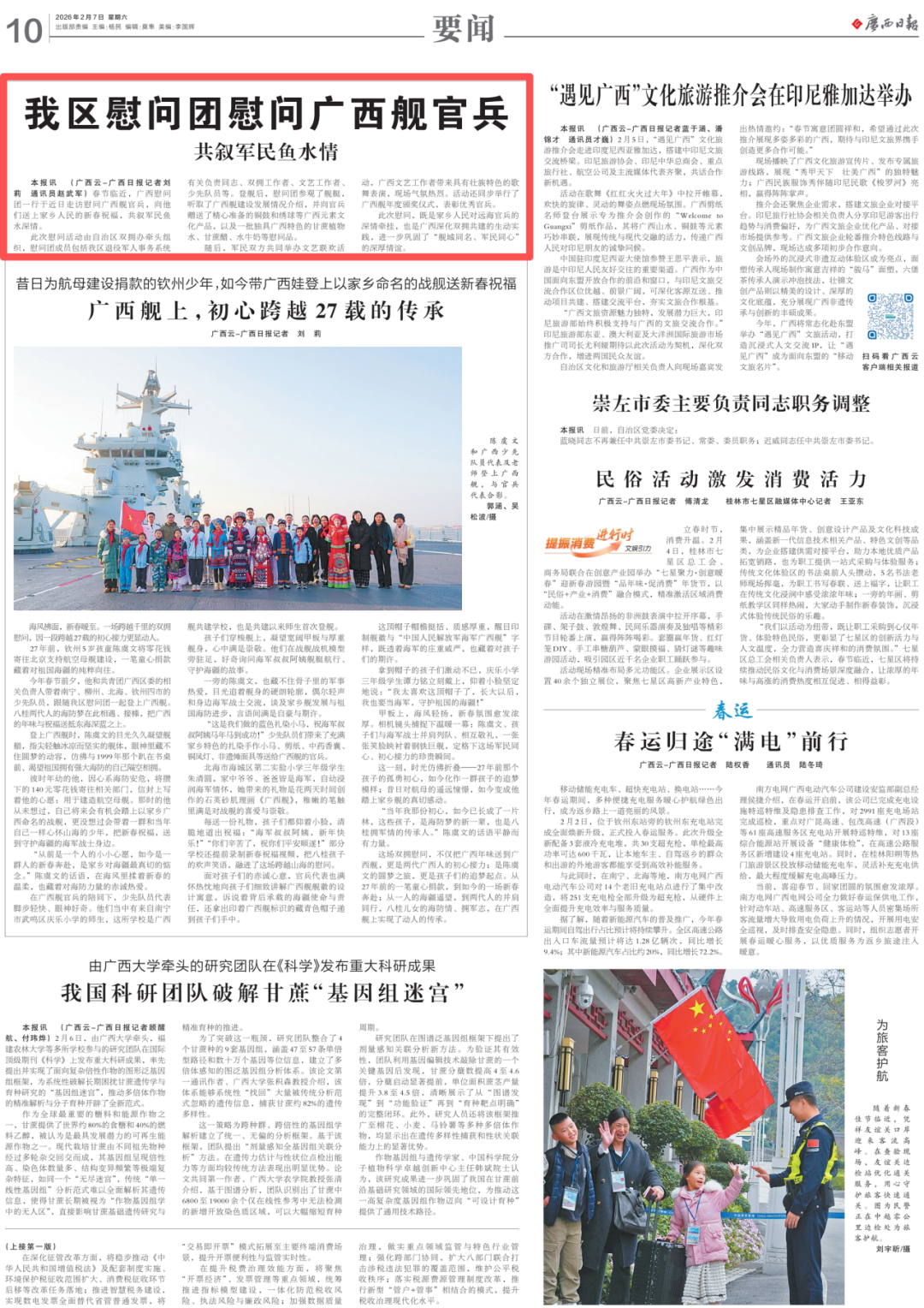 春节临近,广西慰问团一行于近日走访慰问广西舰官兵,向他们送上家乡人民的新春祝福,共叙军民鱼水深情。